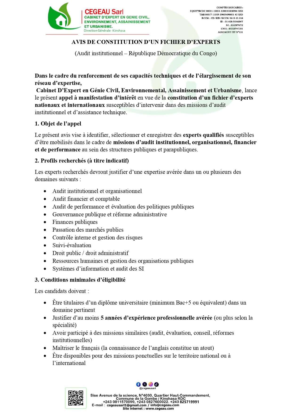 AVIS DE CONSTITUTION D’UN FICHIER D’EXPERTS (Audit institutionnel – République Démocratique du Congo)