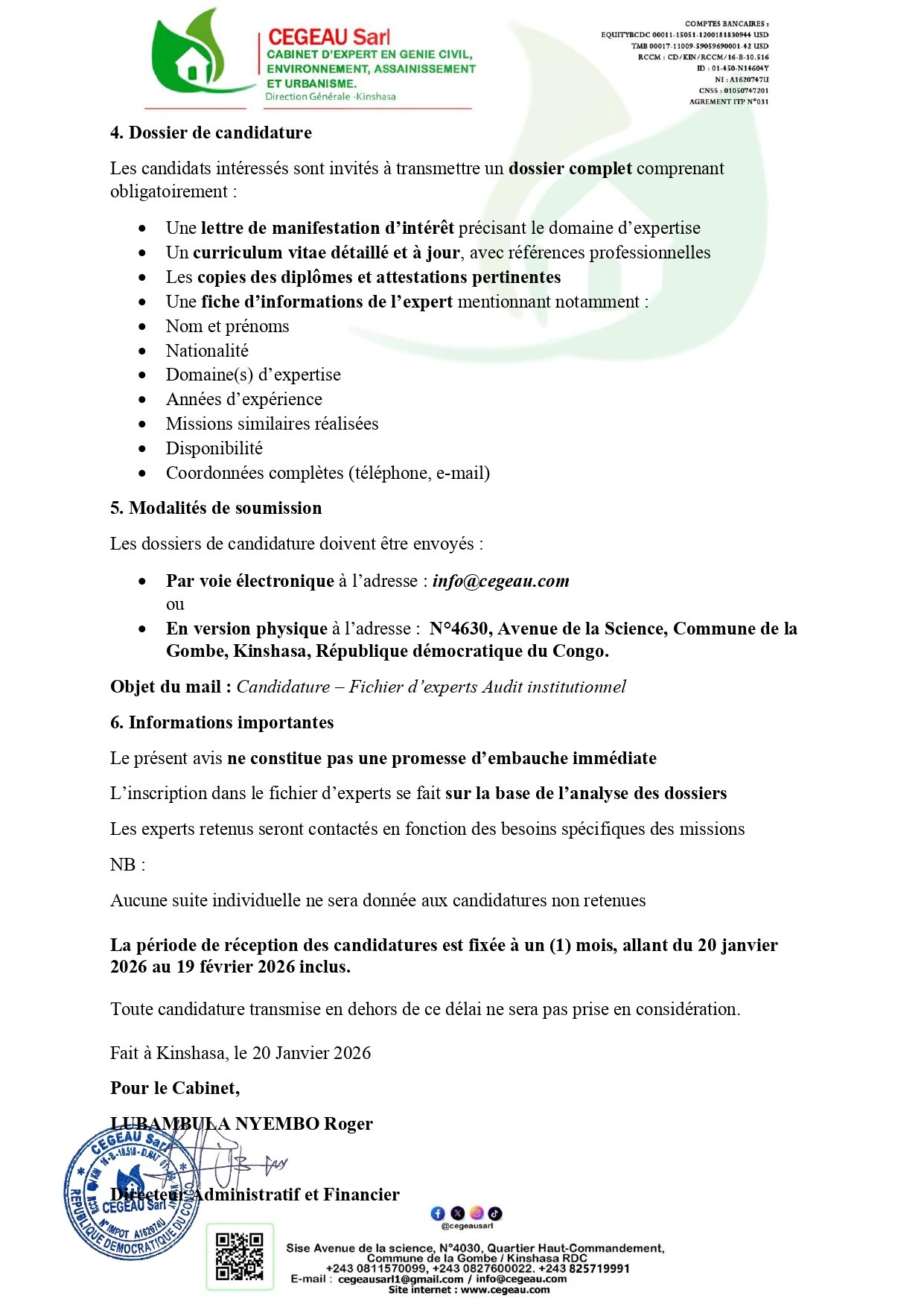 - Ou en version physique à l’adresse : N°4630, Avenue de la Science, Commune de la Gombe, Kinshasa, République démocratique du Congo